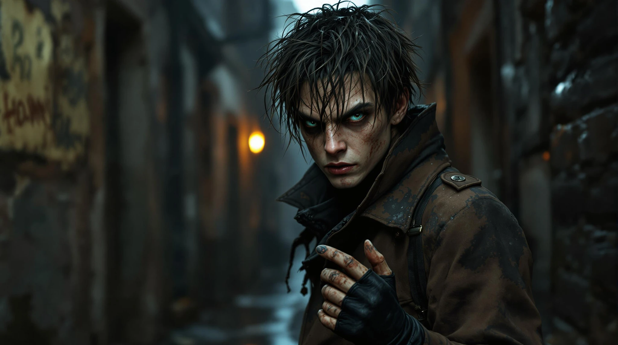 Young, dirty, sinister street urchin, inspired by 'Sweeney Todd: The Demon Barber of Fleet Street'. Set in 1960s Europe, male, early twenties, sharp, narrow face with high cheekbones and pale skin, intense dark eyes with mischievous look, messy, greasy, medium-length hair partially covering one eye, thin, arched eyebrows, dry, chapped lips, stubble on chin, wearing an old, torn, patched trench coat that's a bit too big, several ragged shirts underneath, stained fingerless gloves, long, dirty fingernails, muddy boots, cunning, malevolent aura, standing in an alleyway, dim candlelight reflecting in his eyes, ultra-detailed textures, National Geographic style, DSLR depth of field, cinematic lighting, 4K resolution, very realistic, no modern elements. --ar 9:16 --v 6
