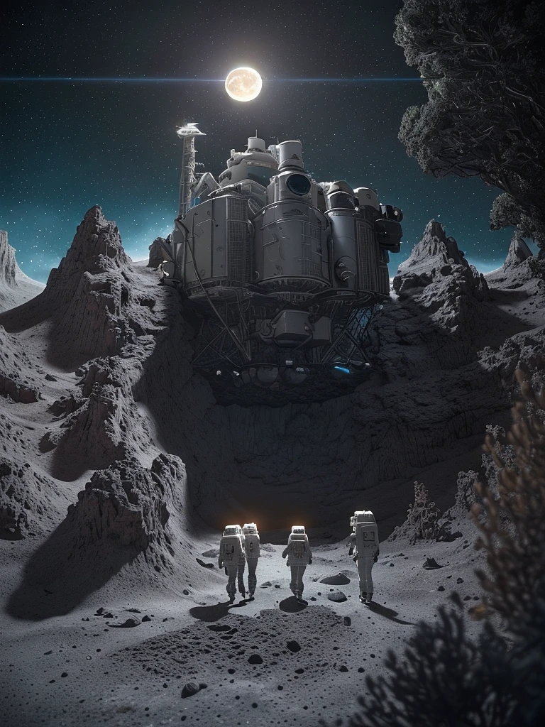 Photo of a ultra realistic moon expedition, bright light, cinematic lighting, battered, low angle, trending on artstation, 8k ultra HD, hyper realistic, focused, extreme details, unreal engine 5, cinematic, masterpiece, art by studio ghibli, intricate artwork by john william turner