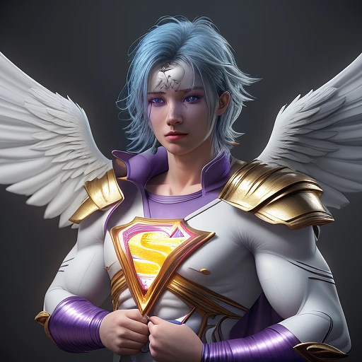 angelic superman warrior::4 hyper-realistic ::5 detailed character expressions :: 3 Ultra-detailed Quality 3D Octane Render :: volumetric lighting :: --ar 9:16 --quality 2 --s 750 --niji 5, with blue hair Saffron - yellow skin and amethyt - purple eyes, , 32K, winning studio photography, profesional color grading, soft shadow, no contrast, clea sharp focus, film photography