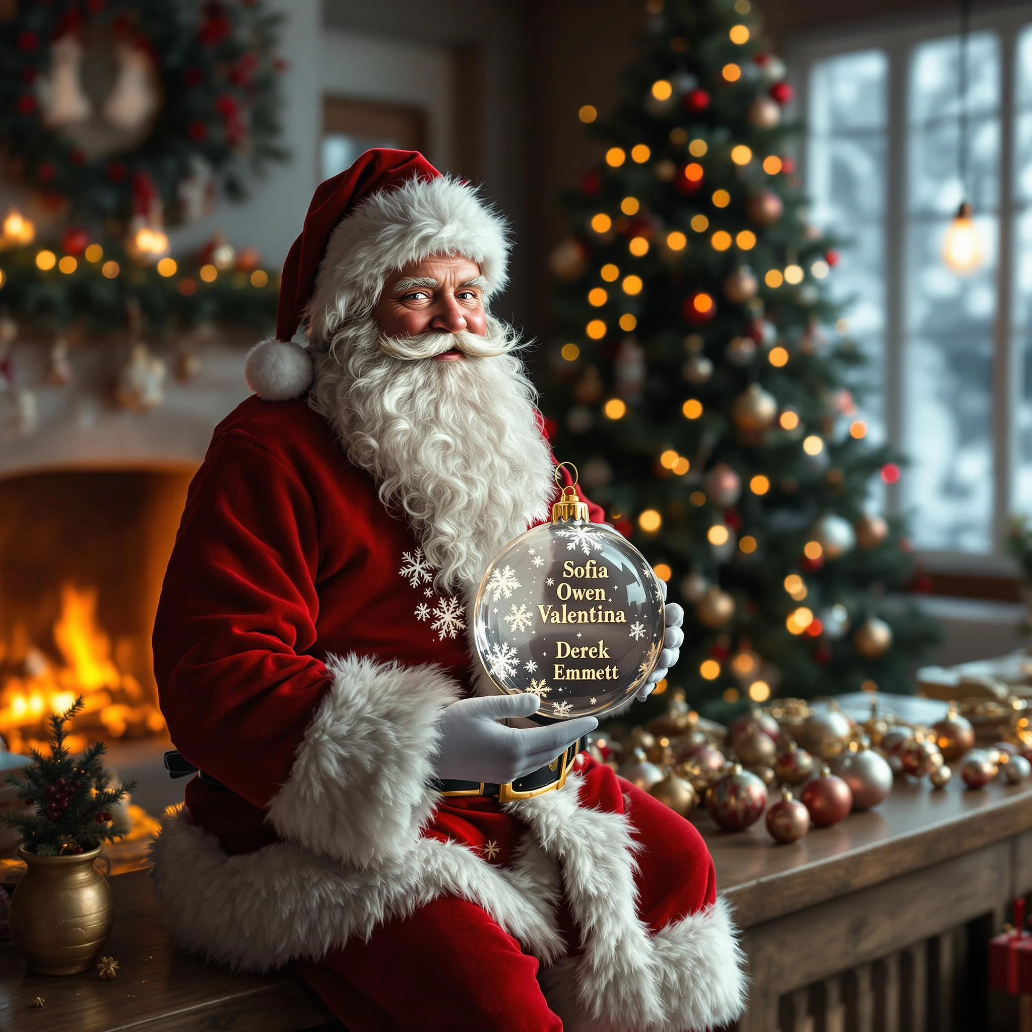 hyperrealistic scene of Santa Claus sitting on a shelf. Santa Claus is holding a translucent crystal ornament with beautiful snowflakes and the names "Sofia", "Owen", "Valentina", "Derek" and "Emmett" engraved in gold. The shelf is filled with many Christmas ornaments. In the background, there is a warm and cozy room with a fireplace and a Christmas tree.