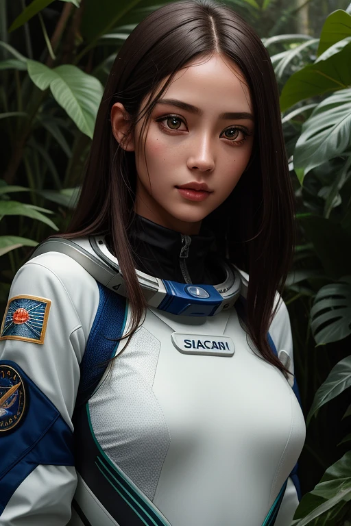 A girl in a spacesuit without a helmet. On another planet in the rainforest. Slim body. A beautiful face. A beautiful face. Realistic face. Beautiful eyes. Clear eyes. Detailed eyes. Beautiful eyes. Symmetrical eyes. Beautiful hair. Detailed hair. High detail. Lots of details. Sexy astronaut costume. Detailed suit. Detailed background. High resolution. Photorealism. High detail. 8k. Ultra quality. A masterpiece. , RAW candid cinema, woman, studio, 16mm, ((color graded portra 400 film) ) ((remarkable color) ), (ultra realistic) , textured skin, remarkable detailed pupils, ((realistic dull skin noise) ), ((visible skin detail) ), ((skin fuzz) ), (dry skin) shot with cinematic camera