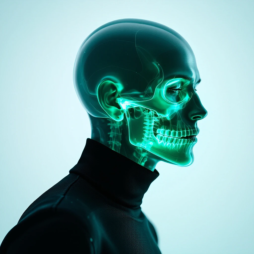 ethereal portrait of a man, transparent skin revealing her skull, glowing with a neon-green bio-luminescent effect, man profile, wearing a sleek, high-collared black outfit, surrounded by a soft glow that contrasts with the sharp details of her skull, background is a minimalist, misty white gradient, enhancing the surreal and sci-fi mood, lighting is soft with a cool futuristic blue tone, illuminating the skeletal structure subtly, created unreal engine 5 rendering, holographic effects, translucent textures, cinematic lighting, cyberpunk aesthetics, x-ray vision style, futuristic materials, sleek minimalism, realism --ar 9:16 --quality 2 --style raw --stylize 50 --v 6. 1