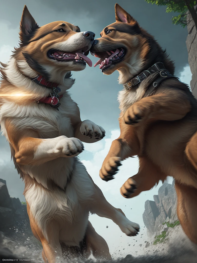 Photo of a ultra realistic two dogs fighting, dramatic light, cinematic lighting, battered, low angle, trending on artstation, 4k, hyper realistic, focused, extreme details, unreal engine 5, cinematic, masterpiece, art by studio ghibli, intricate artwork by john william turner