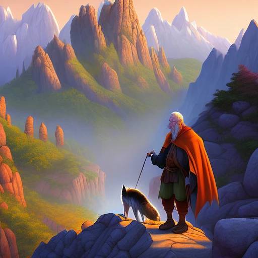 a wise old wizard and his wolf walk along a rocky path, in the background is a giant mountain, vibrant colors, Robert Glenn Ketchum, Dungeons and Dragons, photorealism, 8k, diffuse late afternoon light, inspirational
