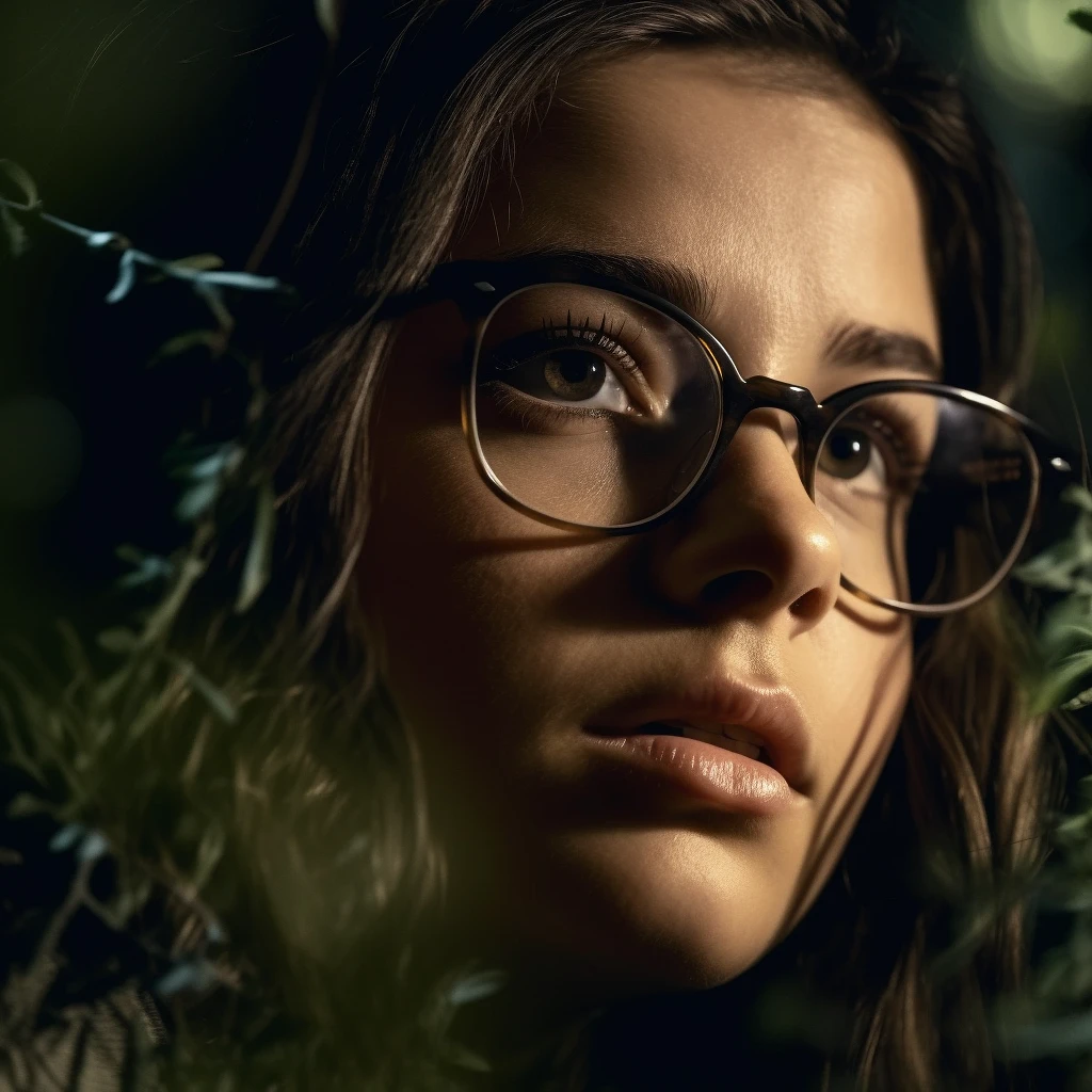 close-up of the face of a worried young lady in dark glasses who has dark wavy hair and who has a doubt face and her eyes look down, everything is surrounded by trees, make it night, hyper-realistic, natural night light , cinematographic --v 5
