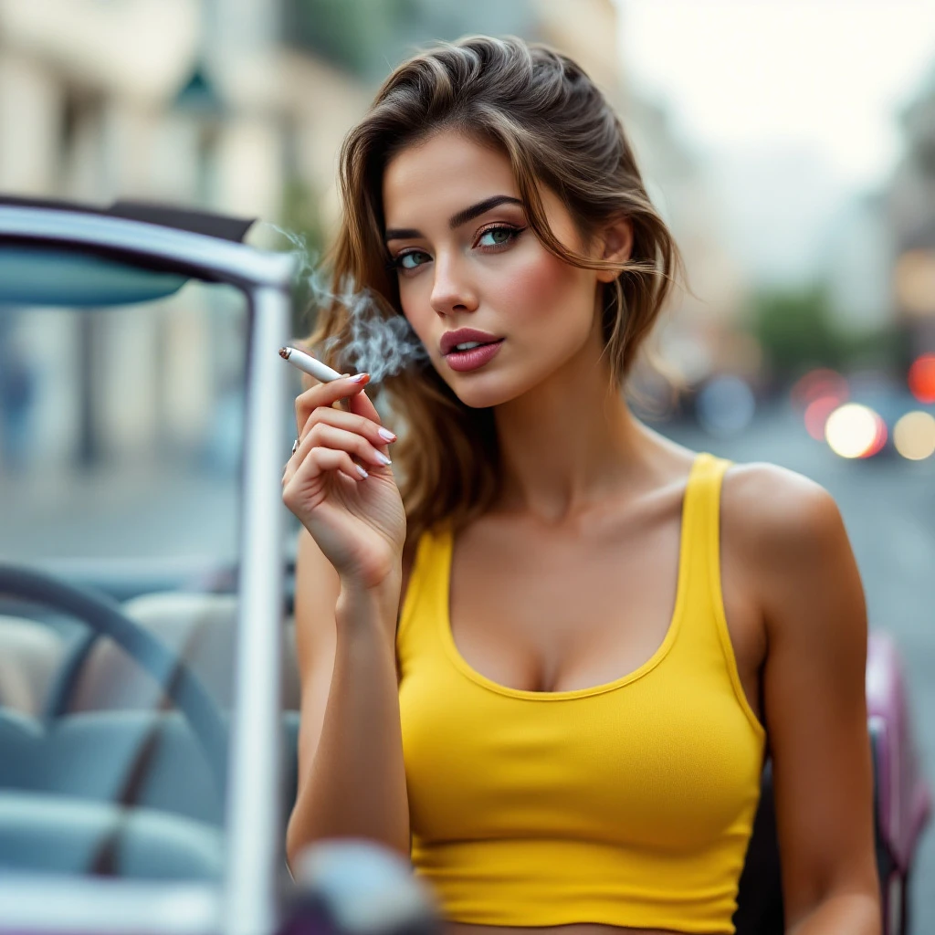 pertty female, She is wearing yellow tank top, The woman is smoking a cigarette, which she holds in her right hand and she is driving a puple Convertible in the street.