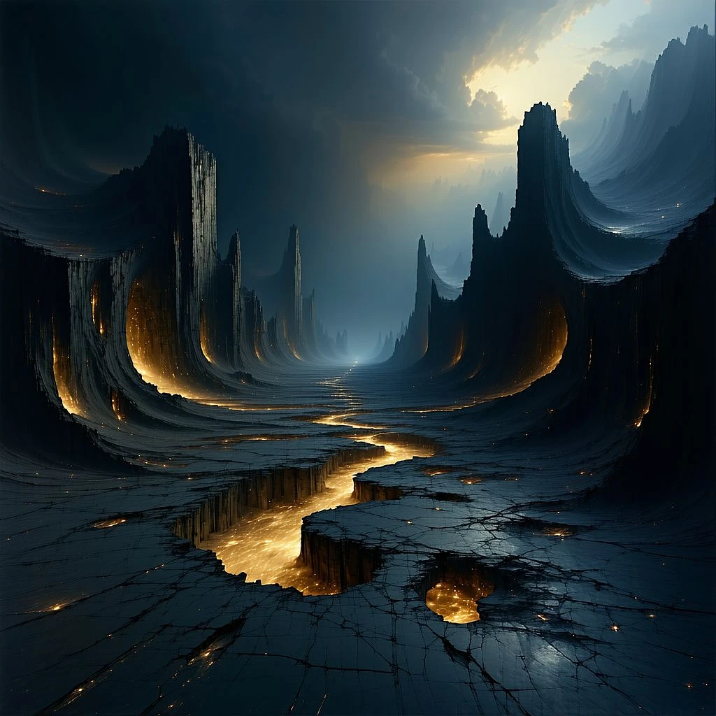 A breathtaking cinematic album cover for "Inner Horizon (Extra Large) ". Imagine a vast, atmospheric landscape where abstract forms of eroded stone or digital circuitry subtly glow with internal golden light, breaking through a dark, muted exterior. The scene should evoke a sense of deep introspection and a journey from chaos to clarity. Incorporate elements that suggest an epic scale and a "stadium rock" vibe, without explicitly showing a stadium. Think U2-inspired mood – grand, emotional, and expansive, with a feeling of emerging light and breakthrough. Dramatic lighting, deep shadows, and subtle, vibrant color contrasts, like a sunrise breaking through a storm. --ar 16:9 --v 6. 0