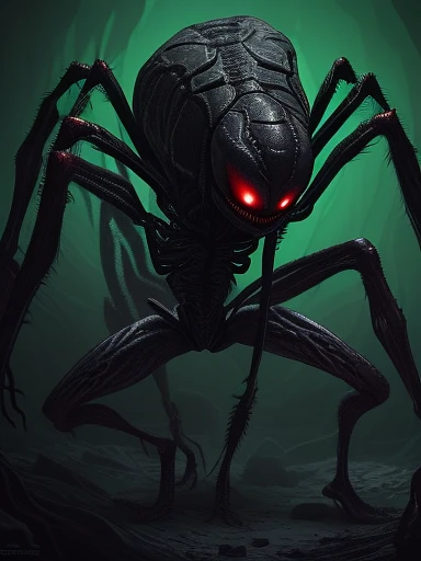 Full body photo of a scary alien creature that looks like a humanoid spider with venom coming out from its mouth emerging from a dark cave, green deadly eyes, horror, dark red skin, intricate design and details, dramatic lighting, photorealistic, cinematic