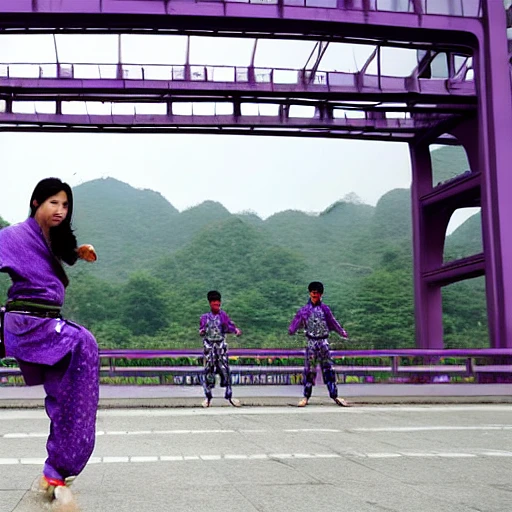A purple-haired, fair-skinned young female warrior practices martial arts on the Nanjing Yangtze River Bridge