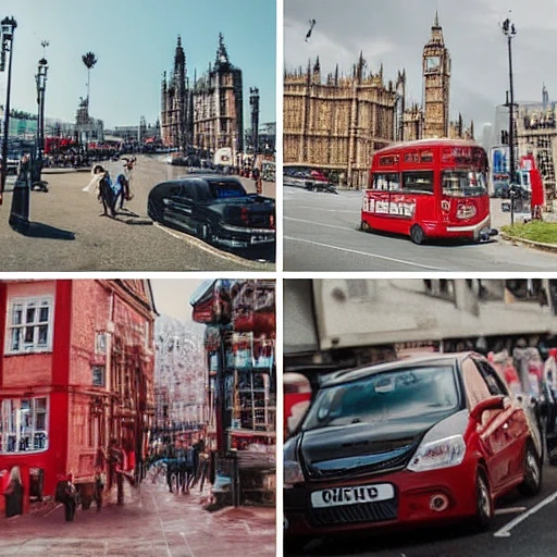 A British European City with cars and people roaming inside of the city, certain aspects of the background are lens blurred, splatters of red and red paint circle significant parts of the city, some of the people are even painted red, black and white photograph painting, real life, realistic, hyperrealistic, very realistic, photo photograph, photo, photograph, collage, oil painting, ultra realistic, very detailed, extremely detailed, highly detailed, HD Quality, 4k resolution, 8k resolution, trending on artstation, in the style of an Album Cover, cool, epic, nostalgic, intricate details
