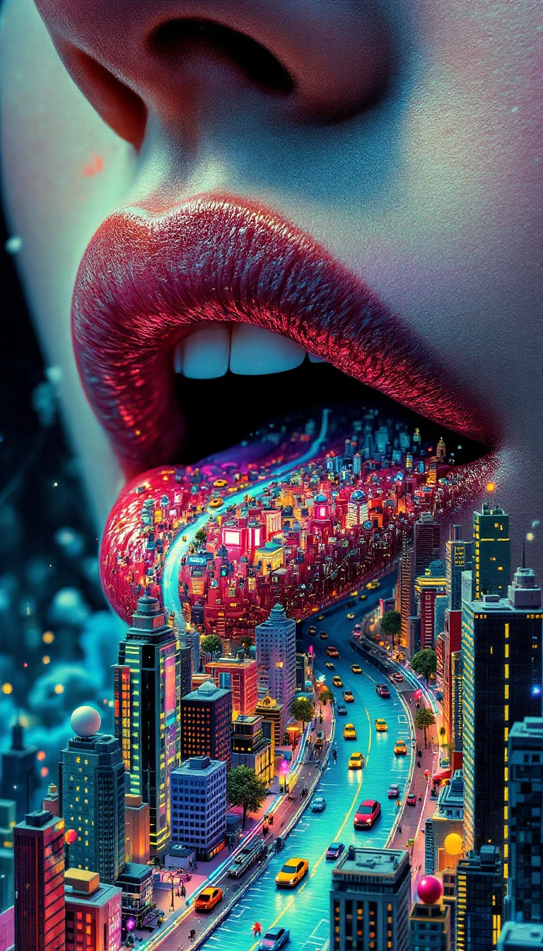 2. A surreal, extreme close-up of a woman's lips, morphing into a bustling, miniature urban landscape, complete with skyscrapers, neon lights, and tiny, animated vehicles navigating the complex streets. Her tongue transforms into a winding river flowing through the city. The style is a bizarre fusion of the micro-detailed world-building of Moebius and the vibrant chaos of urban street art, a testament to the strange landscapes contained within our own bodies.