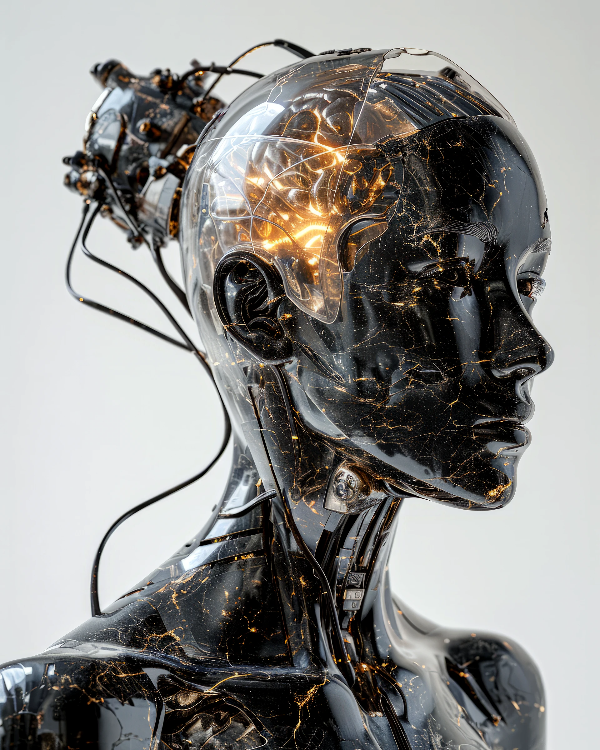 electronic system on humanoid cyborg full body woman with a visible detailed transparent glass brain, burning cable wires, biopunk, cybernetic, cyberpunk, black marble, canon m50 100mm, sharp focus, smooth hyperrealism, highly detailed intricate details carved by michelangelo. --ar 4:5 --s 80 --v 6. 0 --style raw