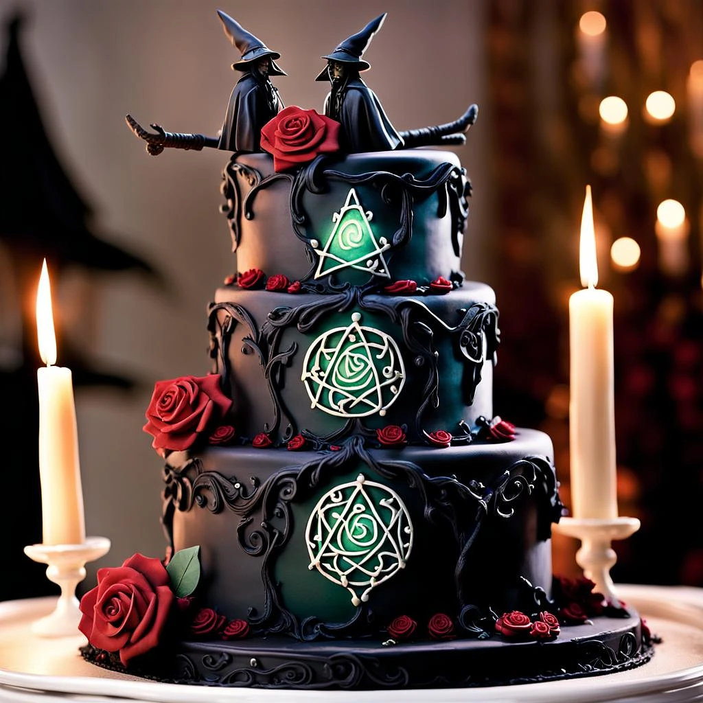 As guests gather around the enchanting witch-themed cake, they notice a mysterious, glowing emblem on its top layer, adorned with spellbinding roses conceals a hidden message, Two miniature witch bride and groom figurines stand atop the cake, each holding a scroll, The cake's candles suddenly light up on their own, casting a mystical glow, realistic magical fantasy, highly detailed, photorealistic, Hyperrealistic, splash art, concept art, mid shot, intricately detailed, color depth, dramatic, 2/3 face angle, side light, colorful background, Professional photography, bokeh, natural lighting, canon lens, shot on dslr 64 megapixels sharp focus