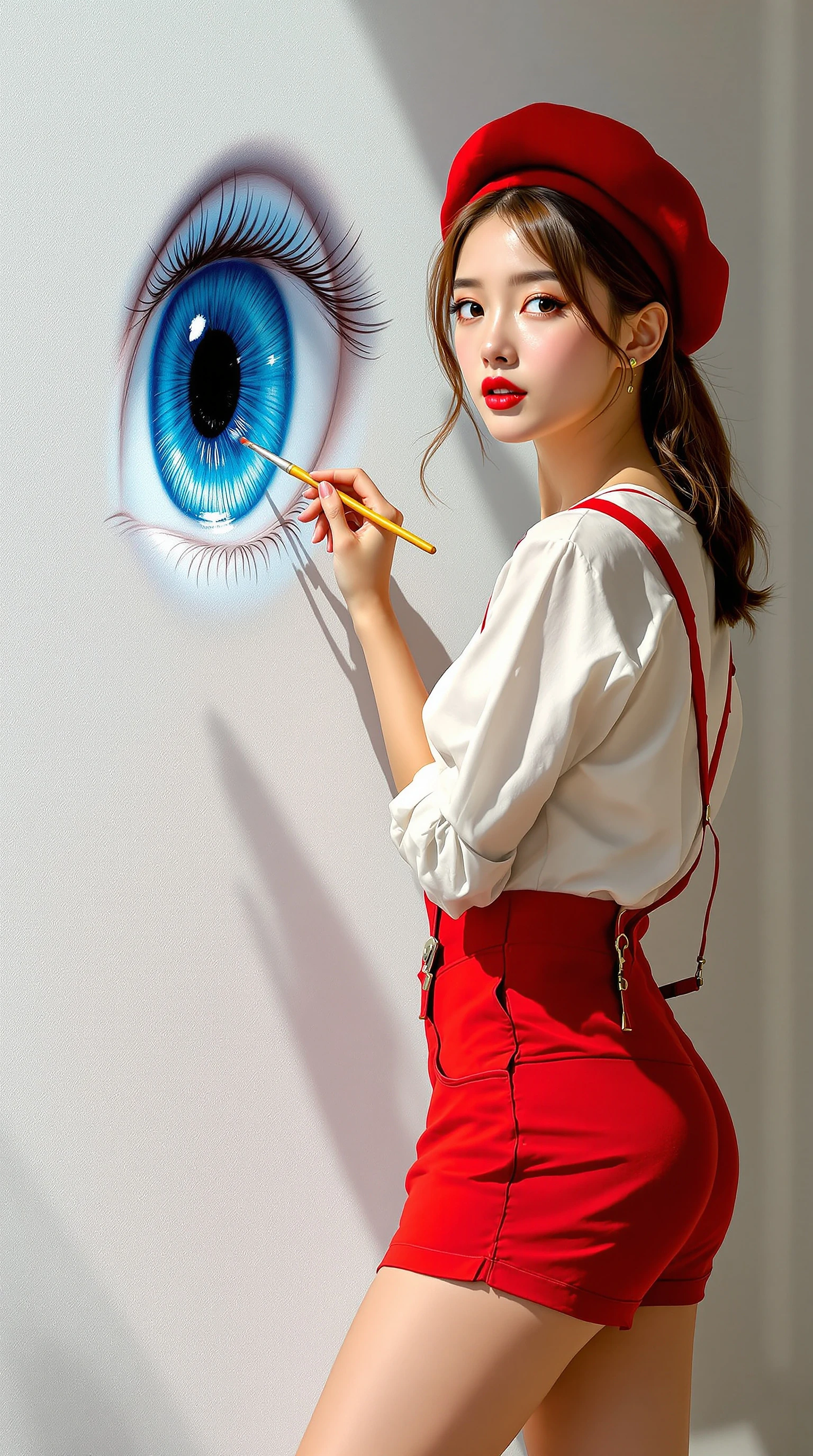Full body view of a Woman (Ethnicity: 1.0) , (Age: 20) , (Clothing Details: 1.2) , (Accessories: 1.2) , (Facial Features: 1.3) , (Expression: 1.2) , (Body Type: 1.2) , (Pose: 1.2) wearing a red beret, a white blouse and red shorts with suspenders, painting a white wall with a brush drawing a big blue eye, detailed hair and eyebrows, fair and bright skin stained with yellow and blue color spots, delicate makeup with red lips, slim body, bare feet, beautiful feet only 5 toes on each foot, show foot, natural light, comic style, digital painting, photorealistic skin texture, 3/4 view, (Detailed Clothing Folds: 1.1) , bright colors and soft lighting, strong shadows, thin wall texture, elegant, comic art, upper body slightly leaning towards the wall, slightly posing; Artistic style, highly detailed illustration, hyper-realistic style, detailed shading, realistic background.