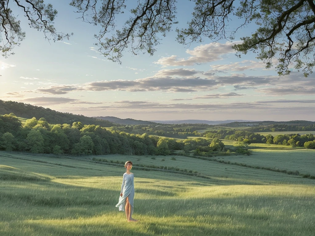 The background is a picturesque landscape with rolling hills, trees, and a body of water in the distance. The sky is a soft, serene blue with wispy clouds, and the lighting is soft and diffused, with a warm glow that suggests a sunny day. The overall effect is one of peace and tranquility, with the woman's elegant pose and the serene natural setting combining to create a sense of calm and serenity.
