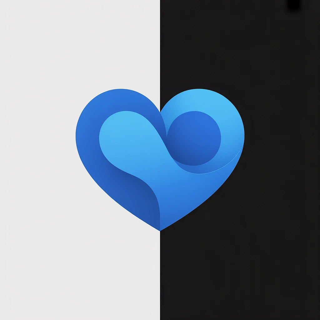 Create a modern, minimalistic blue heart logo on two backgrounds: pure white and pure black. The heart should have smooth, rounded edges and a subtle gradient from deep royal blue (#1E3A8A) at the top to bright sky blue (#60A5FA) at the bottom. The design must be symmetrical with gentle inner curves for a friendly and clean look. The style should be flat with a slight depth effect but no heavy shadows or textures, optimized for pixel-perfect clarity at small sizes (64x64 to 512x512 pixels) . The background should be simple, solid white or black to allow easy background removal, and the overall vibe should be modern, professional, and inviting. The final image should be high resolution and suitable for web logo use.