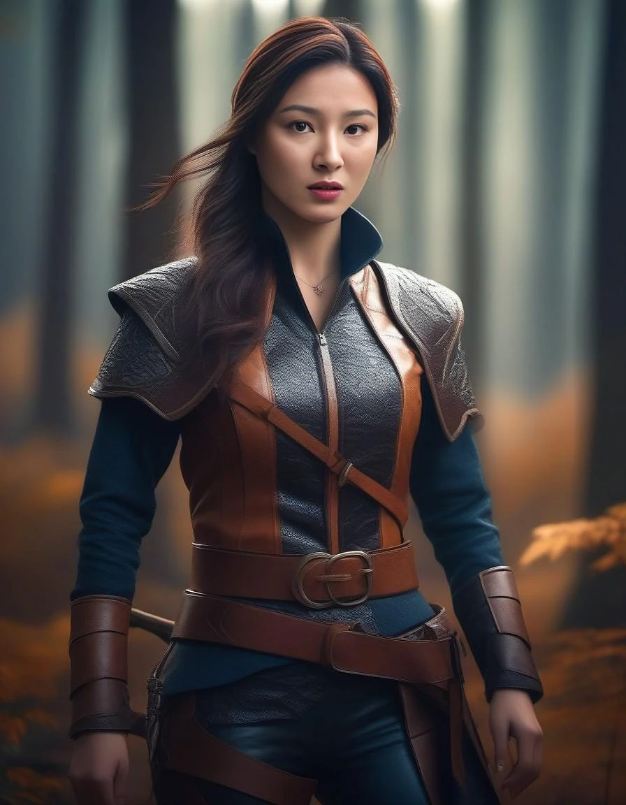 Photo of a beautiful and seductive female hunter wearing leather and cloth attire, upper body, outdoors, forest, fantasy, ultra-detailed, sharp focus, cinematic lighting, octane render, unreal engine, film grain