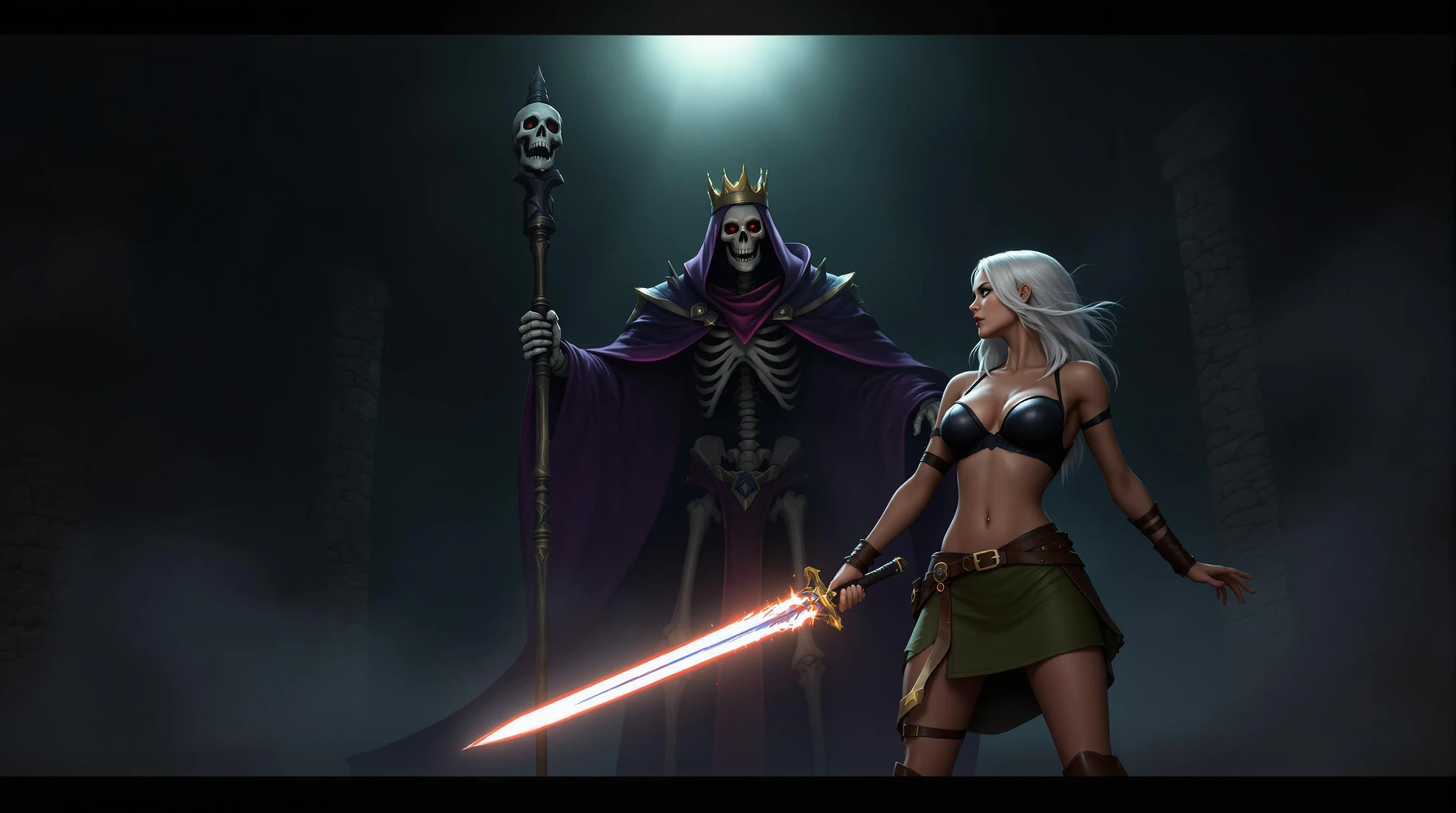 a fantasy scene with a woman and a skeleton king in a dark, misty dungeon. The woman is positioned on the right side of the image, wearing a black leather bra top, a green skirt, and brown boots. She has white hair and is holding a glowing sword in her right hand, with her left arm outstretched behind her. The skeleton king stands behind her, wearing a purple robe and crown, and holding a staff with a skull on top. The background is a dark, misty dungeon with stone walls and pillars, and a bright light shining from above.