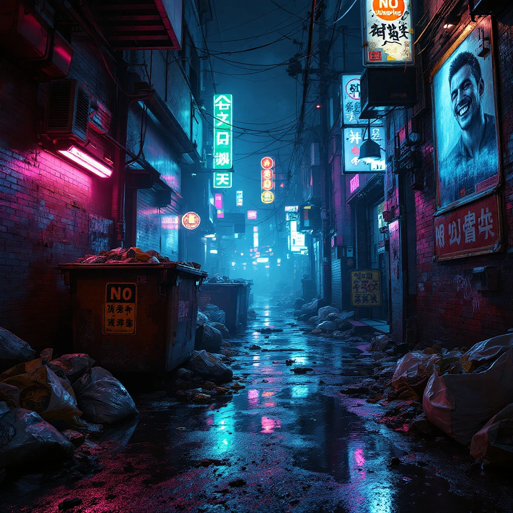 A hyperrealistic 8K cinematic masterpiece blending the gritty, neon-soaked aesthetic of a cyberpunk 1980s Tokyo alleyway with the intense action of a high-tech, futuristic battle. The scene unfolds in a dark, chaotic urban sprawl, alive with swirling fog and flickering neon lights that cast erratic, vivid glows of pink, blue, and fiery amber onto weathered brick walls and reflective puddles on the wet pavement. Expanded Gritty Alleyway Description The alleyway itself is a portrait of urban decay, more filthy and oppressive than ever. Overflowing dumpsters, their lids dented and askew, spill refuse across the alley, with garbage bags torn open to reveal rotting food and broken bottles. Pools of murky liquid gather near the rusted trash cans, their surfaces glistening with oil slicks under the neon glow. A faded and tattered “NO DUMPING” sign clings desperately to a graffiti-covered wall, half obscured by a massive poster of a grinning male model advertising a long-forgotten cologne. The poster is ripped and smeared with grime, while around its edges, brownish stains drip downward, adding to the bleakness. Strewn across the ground are discarded newspapers, cigarette butts, and shattered glass, crunching ominously underfoot. The air is heavy with the smell of damp concrete, mold, and decay, creating a palpable sense of discomfort that immerses the viewer in this oppressive environment. Neon Sign Detail: "HEATWAVE" High above the chaos, a cracked neon sign reading "HEATWAVE" flickers erratically. Its letters are inverted and distorted to resemble a mirrored "3", creating an unsettling visual effect as the buzzing neon tubes pulse with vivid pink and electric blue light. The sign is tilted at an awkward angle, secured haphazardly to a weathered metal frame. Sparks occasionally sputter from exposed wiring, raining faintly glowing embers down into the smoky abyss below. The distorted lettering adds a surreal, almost otherworldly touch to the gritty realism of the alley, ensuring that the sign is both an eye-catching centerpiece and a symbolic marker of the dystopian scene. License Plate Detail: The DeLorean The iconic DeLorean is prominently featured in the foreground, its brushed silver body reflecting the chaotic interplay of neon lights and tracer fire. Its taillights glow intensely—one a fiery red, the other amber—cutting sharply through the fog and mirrored in the oily puddles beneath. On the car’s license plate, the text reads “RED BEAR RAD”, with “RAD” emphasized in bold, capitalized letters, underscoring the vehicle’s retro-futuristic and rebellious aesthetic. Every surface of the DeLorean is rendered with breathtaking detail, from the faint scratches in its metallic panels to the streaks of dirt and soot smeared across its iconic lines. Background Characters and Elements In the middle ground, faintly illuminated by the glow of neon and tracer fire, a terrified stray cat leaps from an overturned trash can, its eyes wide with fear, mid-flight. Its fur is ruffled and matted, as if it has been surviving the harsh streets for far too long. Nearby, a pair of shadowy figures lurk at the edge of the frame—one leaning against the wall with a weapon loosely gripped in hand, the other crouched behind a dumpster, their faces obscured by smoke and the hoods of their jackets. They exude an air of silent menace, suggesting they are either waiting for the right moment to strike or observing the unfolding chaos. A flicker of movement in the far distance reveals a small dog, sprinting away from the scene with its tail tucked between its legs, vanishing into the shadows. These subtle background details add layers of tension and life to the already dynamic setting. Final Scene Recap A hyperrealistic 8K cinematic masterpiece blending the gritty, neon-soaked aesthetic of a cyberpunk 1980s Tokyo alleyway with the intense action of a high-tech, futuristic battle. The scene unfolds in a dark, chaotic urban sprawl, alive with swirling fog and flickering neon lights that cast erratic, vivid glows of pink, blue, and fiery amber onto weathered brick walls and reflective puddles on the wet pavement. The alleyway is an oppressive portrait of urban decay: overflowing dumpsters with dented lids spill refuse across the ground, including torn garbage bags revealing rotting food and broken bottles. Murky, oily puddles form near rusted trash cans, reflecting the distorted neon signs above. A tattered "NO DUMPING" sign clings to a graffiti-covered wall near a massive, grimy, torn poster of a grinning model advertising a long-forgotten product. The air is thick with the smell of damp concrete, mold, and decay, immersing the viewer in this oppressive environment. Above the chaos, a cracked neon sign reading "HEATWAVE" flickers erratically, with letters inverted to resemble mirrored "3"s. The distorted lettering creates an unsettling effect as the buzzing neon tubes pulse in pink and blue. Sparks rain down from the broken sign, casting faint, glowing embers into the smoky abyss. Prominently in the foreground is a brushed silver DeLorean, its iconic lines covered with streaks of dirt and soot. The taillights glow red and amber, mirrored in the puddles below. On its license plate is the text “RED BEAR RAD, ” with "RAD" boldly emphasized in capital letters. In the middle ground, a terrified stray cat leaps from an overturned trash can, eyes wide in fear, its matted fur flying. Nearby, shadowy figures lurk—a hooded figure crouches behind a dumpster with a weapon, while another leans against the wall, half-hidden by the swirling smoke, radiating menace. In the distance, a small dog sprints away, tail tucked, disappearing into the foggy shadows. The focal point is an android combatant crouched in the heart of the alley, her sleek metallic body gleaming with precision under the flickering neon glow. Her piercing blue eyes contrast against the chaotic urban backdrop, where every detail—from the grimy tex