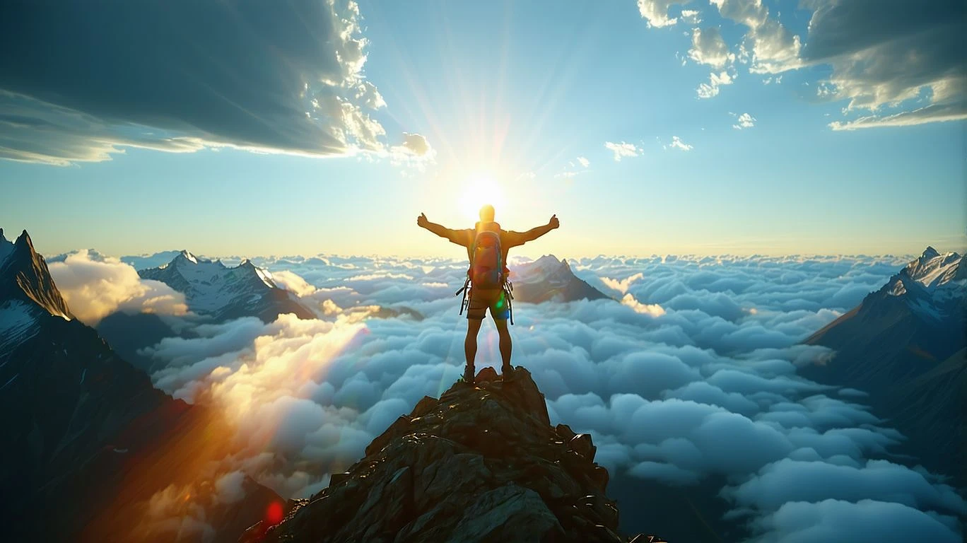 A breathtaking wide shot of a climber standing triumphantly at the peak of a high mountain, gazing at the sunrise. The moment captures ultimate success after a long journey, symbolizing persistence and achievement. Ultra-realistic, 8K, cinematic lighting, dramatic clouds, and sun rays shining through.
