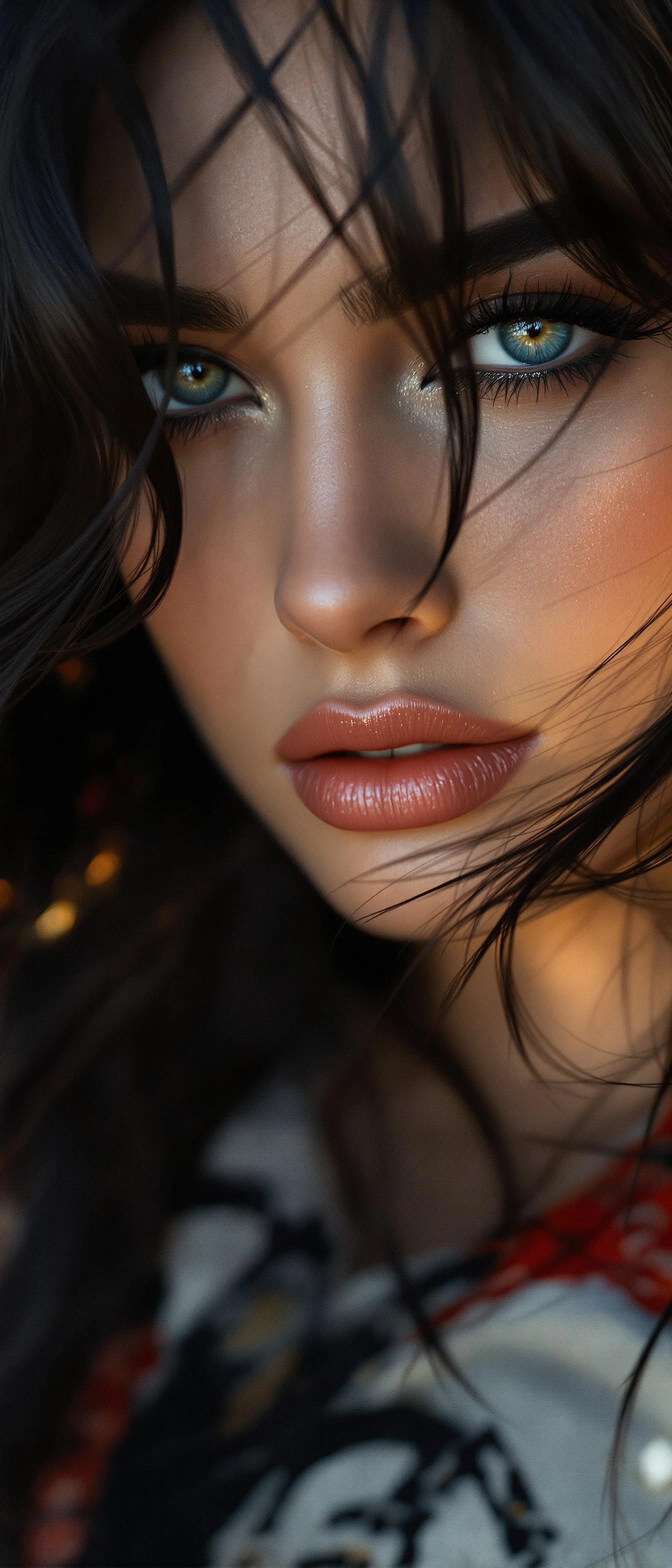 "Professional, high-resolution portrait, editorial photography Sony A1 camera, 50mm lens, cinematic style, warm golden hour light, soft pastel colours, close-up view, supermodel early 20's, fair skin, windswept voluminous raven black hair, striking blue eyes, bold black eyeliner and glitter, red and black feathers, soft focus, sharp contrast, gentle, soothing atmosphere. "