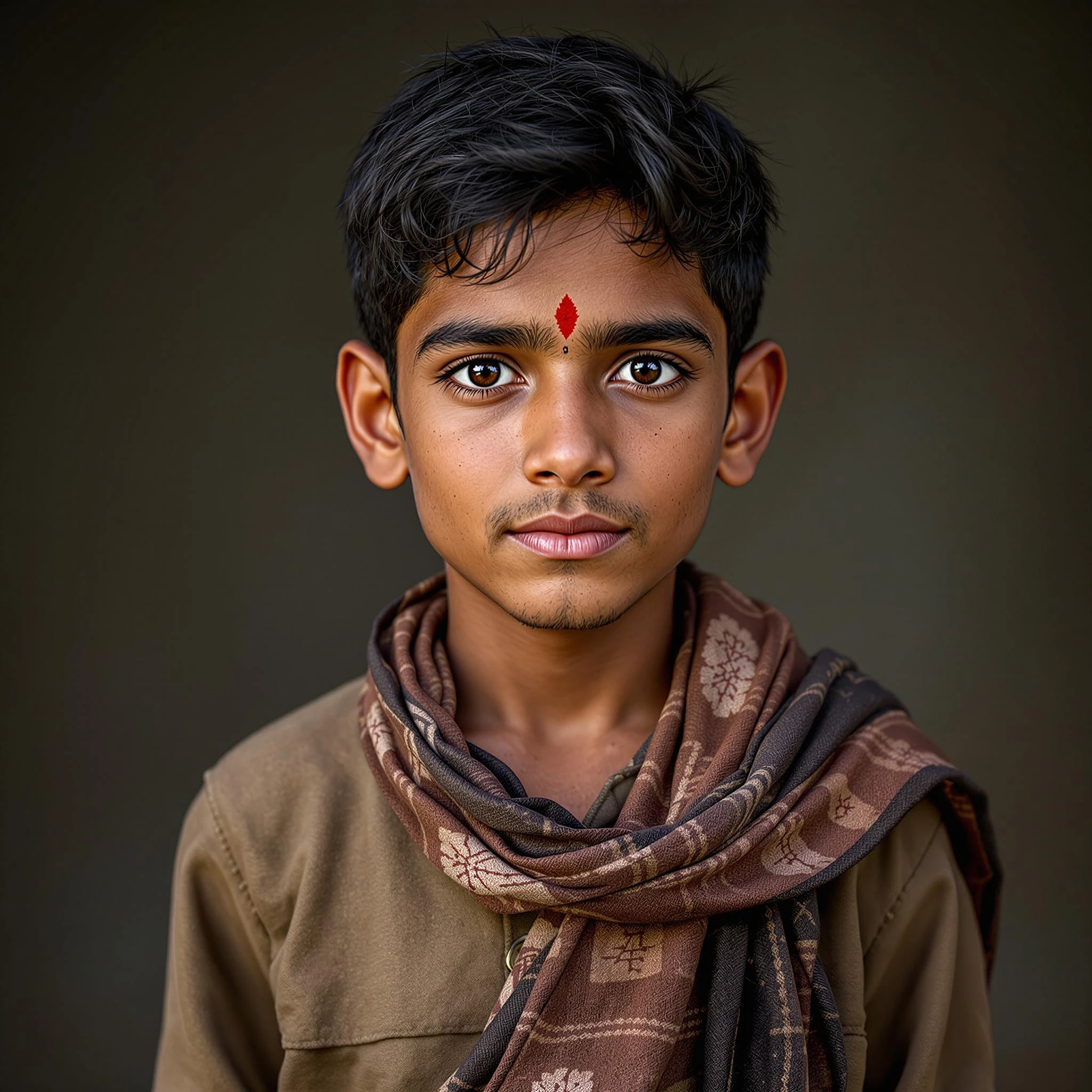 create a image of a 10 year old boy who has fair face and black hairs dressed in village clothes his race is indian