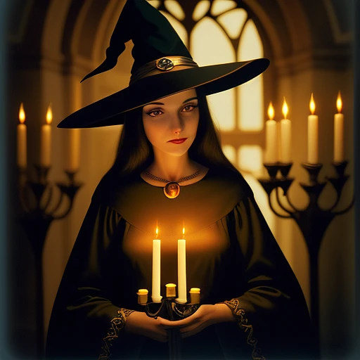 create image of woman, stylish witch hat, woman, night time, woman holding a Candelabra with lit candles, art deco, inside monestary, cinematic lighting, kodak portra 600 --ar 9:16