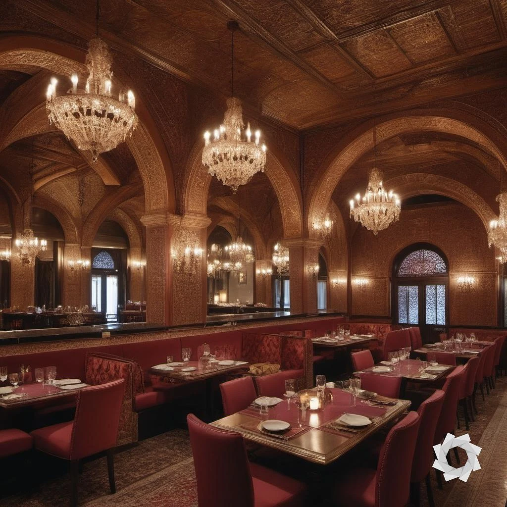 Picture a fine dining restaurant exuding the opulent charm of Ottoman style interior design. Ornate arches and intricate tilework adorn the walls, while elegant chandeliers cast a warm glow over the plush furnishings. Luxurious fabrics in rich hues of gold, red, and purple add a regal touch to the seating areas, inviting guests to indulge in a lavish dining experience fit for royalty. Elaborate wood carvings and traditional motifs further enhance the ambiance, transporting diners to a bygone era of grandeur and refinement.