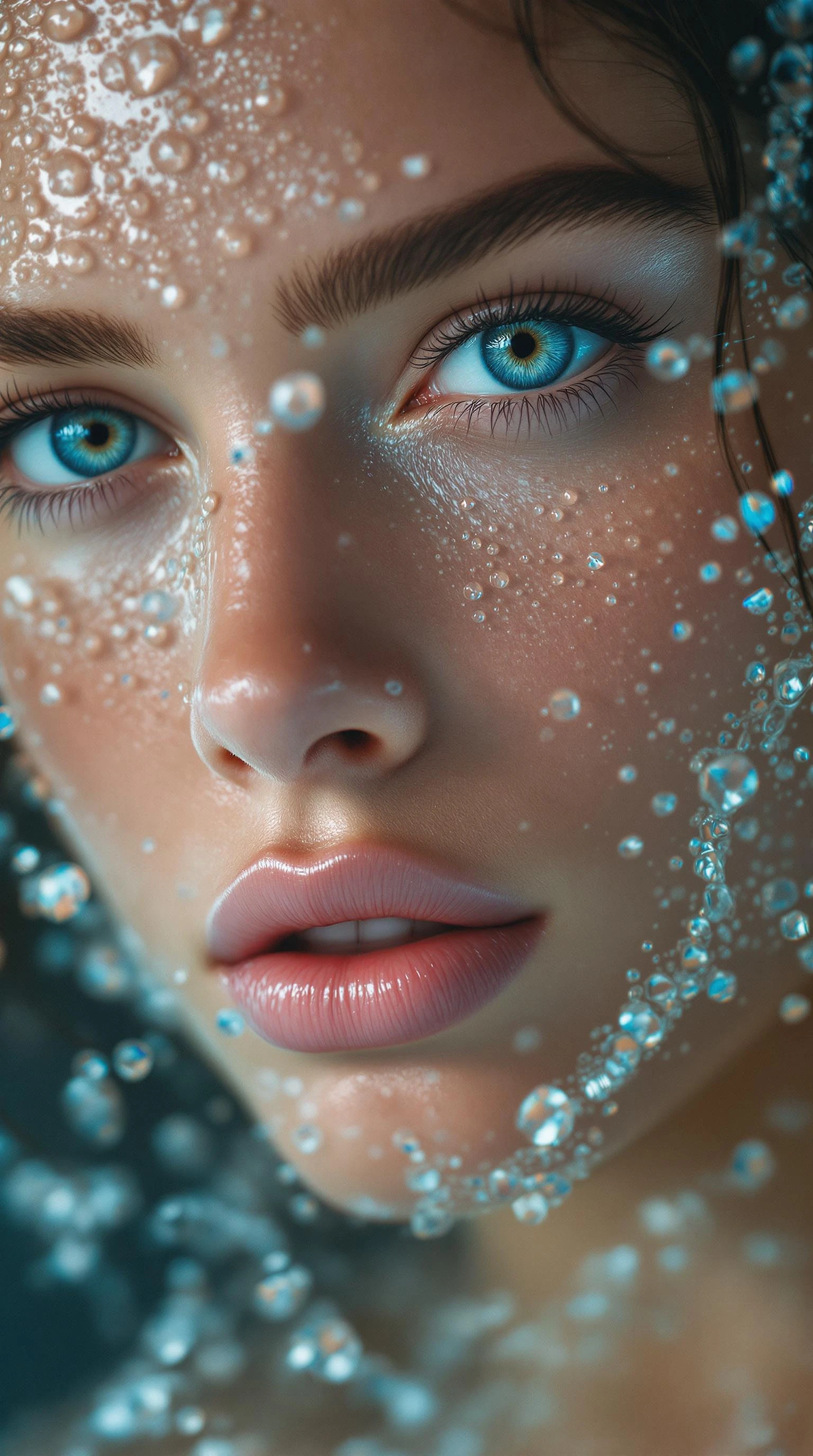 "Image is a captivating high resolution close up portrait photograph captured with a Sony A1 camera. Featuring a beautiful lithe supermodel in her early 20s, submerged in water, highlighting crystal clear drops and streams gliding across her skin. She has extremely detailed large, intense, piercing vibrant sapphire blue silver grey eyes staring directly into the lens. The water acts both as a veil and amplifier, enhancing the textures and fine details of the skin, while evoking a serene, ethereal quality. ”