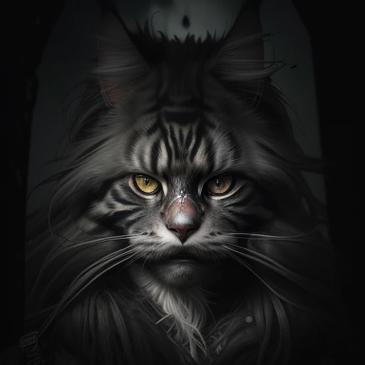 Maine coon portrait, mask on face, morbide, dark, very detailed, rendered in octane, wet, dense atmospheric, epic, dramatic, empty, creepy, trail cam footage, photorealistic, hyperornate details, photographed Haris Nukem