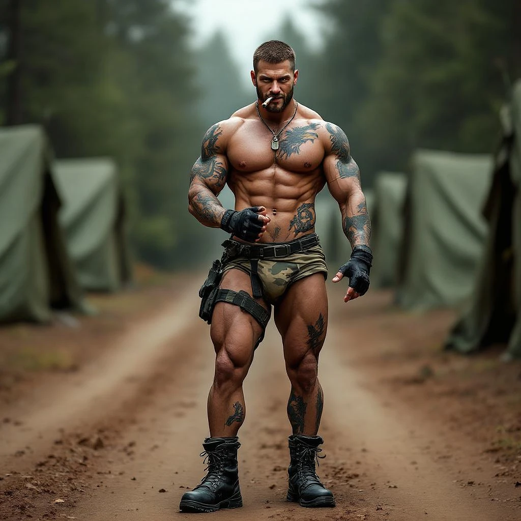 Chris Redfield, Full body image, looking at us, shirtless, slender tall muscular body, lots of tattoos, eagle chest tattoo, dog tags, big cigar in mouth, black fingerless gloves, camouflage pouch thong underwear with huge long penis bulge, vis8ble penis line to knees, big feet in black combat boots, standing on dirt road with army green tents, flexing one bicep, grinning