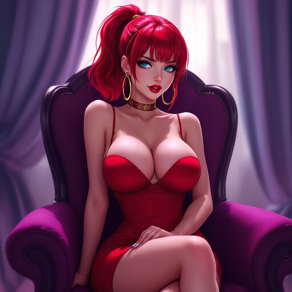 anime, woman, red hair, short ponytail, curtain bangs, cyan eyes, red lips, red bodycon dress, tight dress, red high heels, golden sterling hoop earrings, bare legs, closed cleavage, massive chest, with straps, sitting on a chair