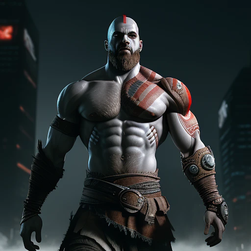 create image of man, style Kratos from God of War (2018) as a cyborg :: Cyberpunk Adam Smasher, volumetric fog, perfect composition, insanely detailed, 4k, HDR --no blur --no blurry --v 4