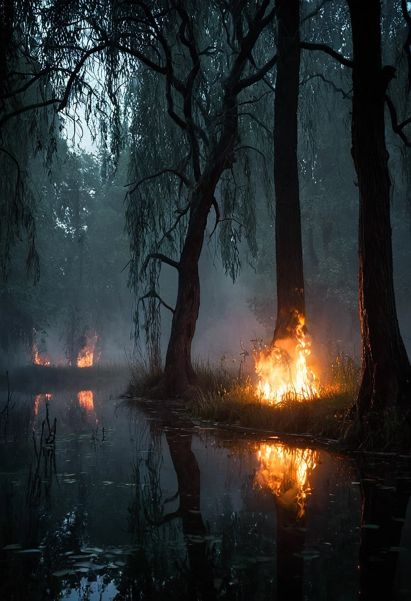 A dense, shadowy forest at the edge of a mist-shrouded willow grove, where the light from an unseen fire dances across the water and creates an eerie glow in the distance.