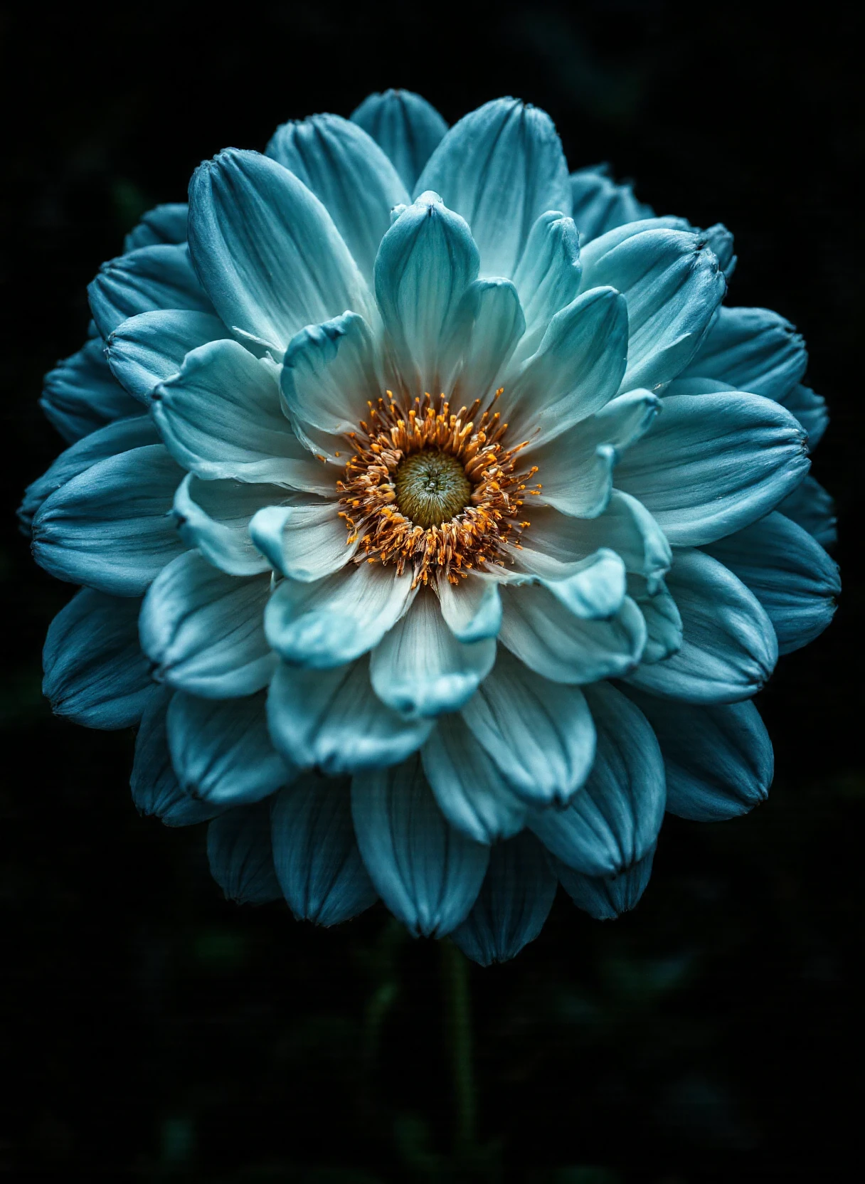 The image depicts a highly detailed and stylized closeup rendering of a flower. The petals are depicted with a translucent quality, giving them an ethereal appearance. They have a gradient of colors ranging from light turquoise to deeper teal hues, creating a sense of depth and dimensionality. The center of the flower features intricate details, including a cluster of stamens that appear to be glowing with an orange-yellow hue, adding contrast against the cooler tones of the petals. The background is dark, which helps to highlight the vibrant colors and textures of the flower. This artistic representation emphasizes the beauty and complexity of natural forms through digital manipulation.