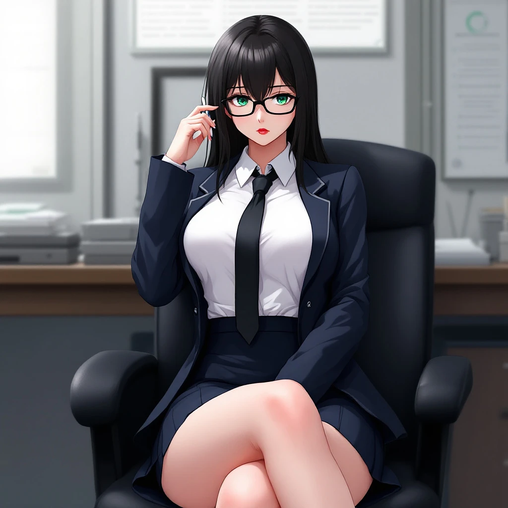 anime, woman, black hair, long hair, green eyes, wearing black glasses, red lips, white shirt, black tie, black blazers, tight blazers, short dark blue skirt, highschool skirt, white socks, black shoes, bored expression, big chest, sitting on a chair at an office, sitting with legs crossed, skinny belly, holding pen in hand, bare hands