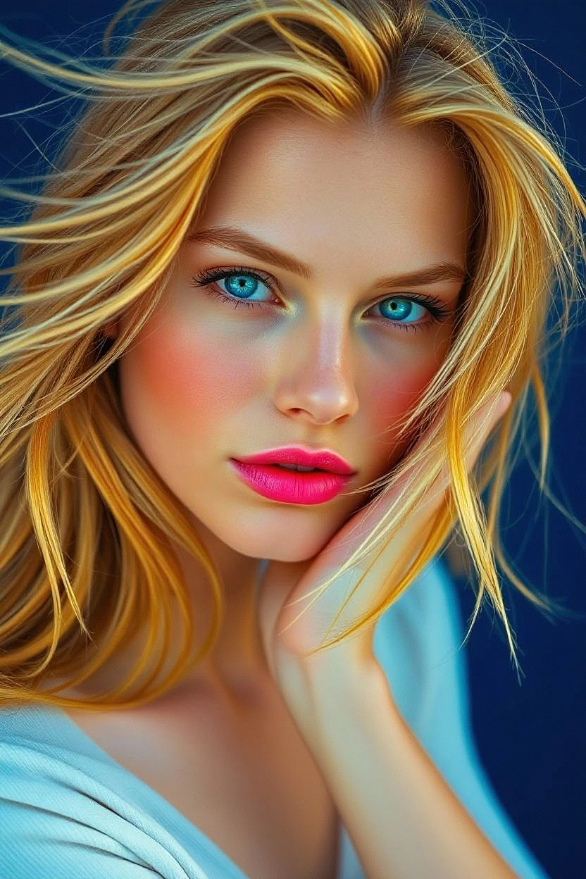 "High resolution close up head and torso portrait photograph image, cinematic style, vibrant complimentary colours, of a fair-skin supermodel early 20s. Windswept golden blonde hair frames her face. detailed sapphire blue-green silver eyes, natural makeup, parted full pink lips, Calm serene expression, white long-sleeved top, hand resting on cheek. Deep blue background contrasts with warm tones. Centered composition. "