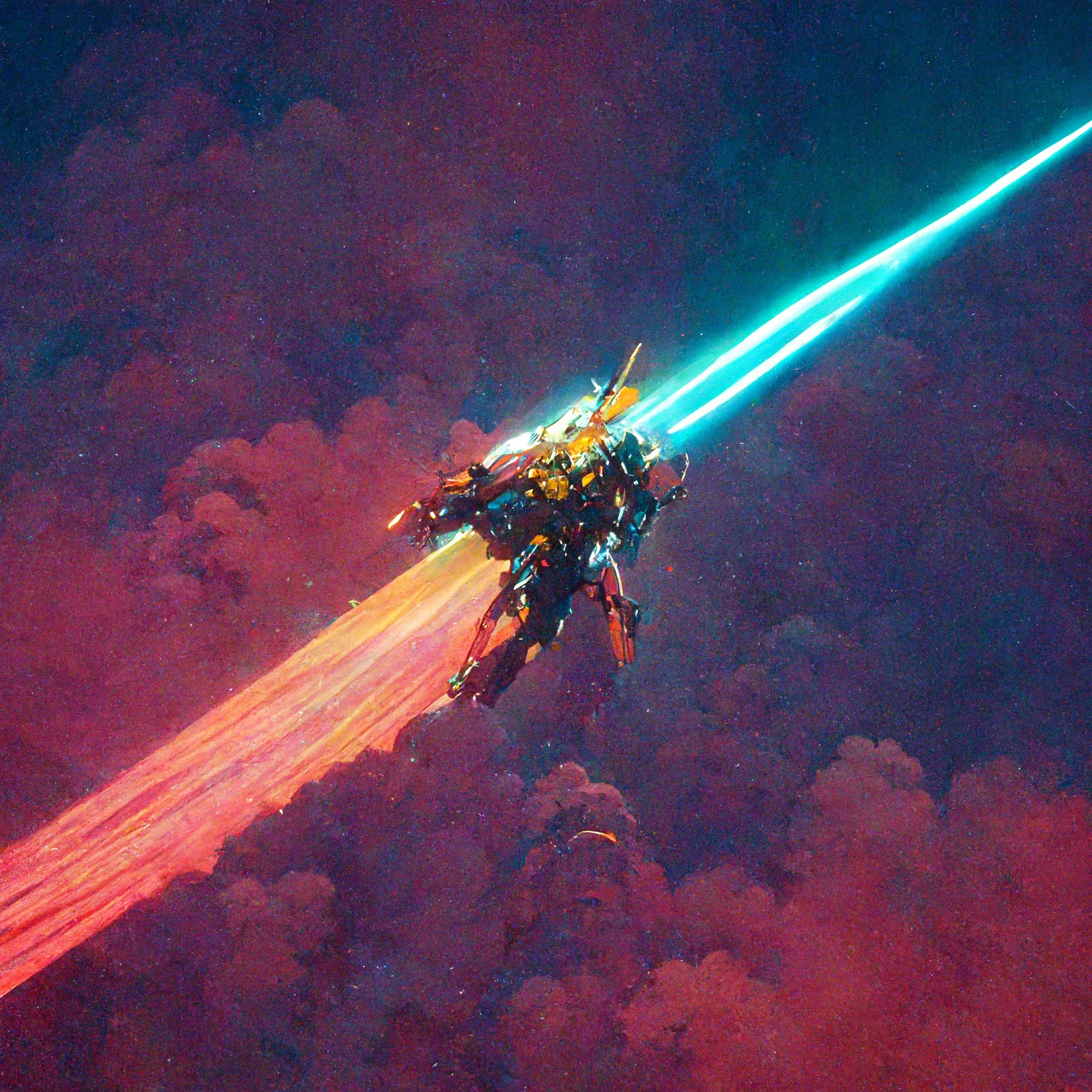 a Futuristic cyberpunk neon Winged Gundam robot floating in the sky covered in lightning, powerful thrusters shooting from the feet, elegant, hands radianting, eyes shooting thunder, body is divine, body is celestial-like, colorful, vibrant, god-like, nebula in space, sci-fi, multiple stars, multiverse, photorealism, hyper realistic, high detailed, low contrast, 8k render, in Yoshikazu Yasuhiko anime style --s 5000