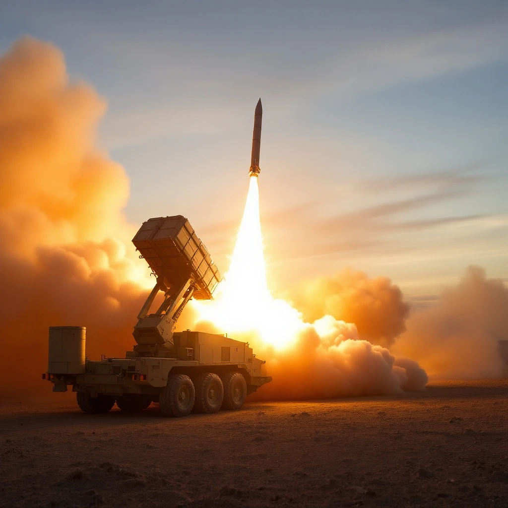 The MIM-104F Patriot missile vehicle launches a missile at sunrise.