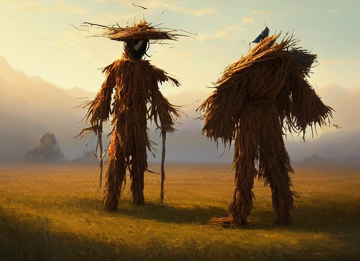 beautiful and detailed 4 k digital landscape painting of a huge scarecrow, concept art, sharp focus, masterpiece, trending on artstation, scarecrow on a beautiful landscape by greg rutkowski, greg hildebrandt and studio ghibli
