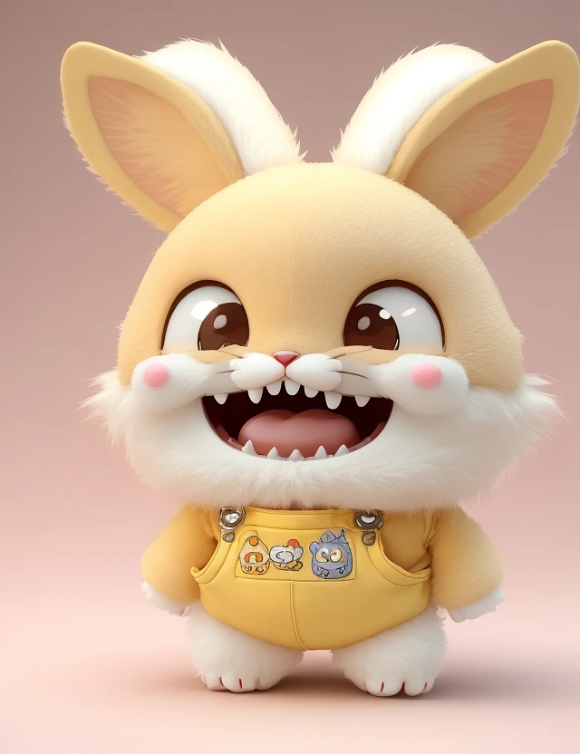 3D animation character minimal art toy , a cute chibi monster rabbit charactor inspired doraemon , big eyes coppy wheel, Closed smile very widely , very sharp teeth , happy still alive , pastel light brown , cream color, detailed fur design by a Sanrio style ((( create fantacy gold overalls carharttin spired by a Donatella Versace ) )), beautiful full mouth, happy still a life, very detailed face, striking elegant power poses, shiny mood , bioluminenscent lingting, on white background.