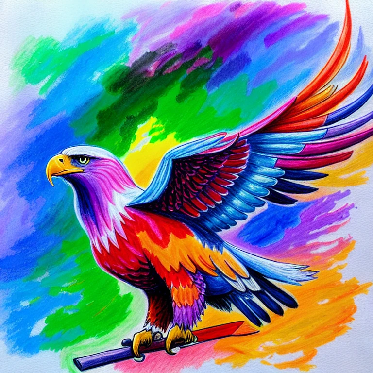 a colorful crayon drawing of a eagle flying across the sky, in the style of pont-aven school, rainbowcore