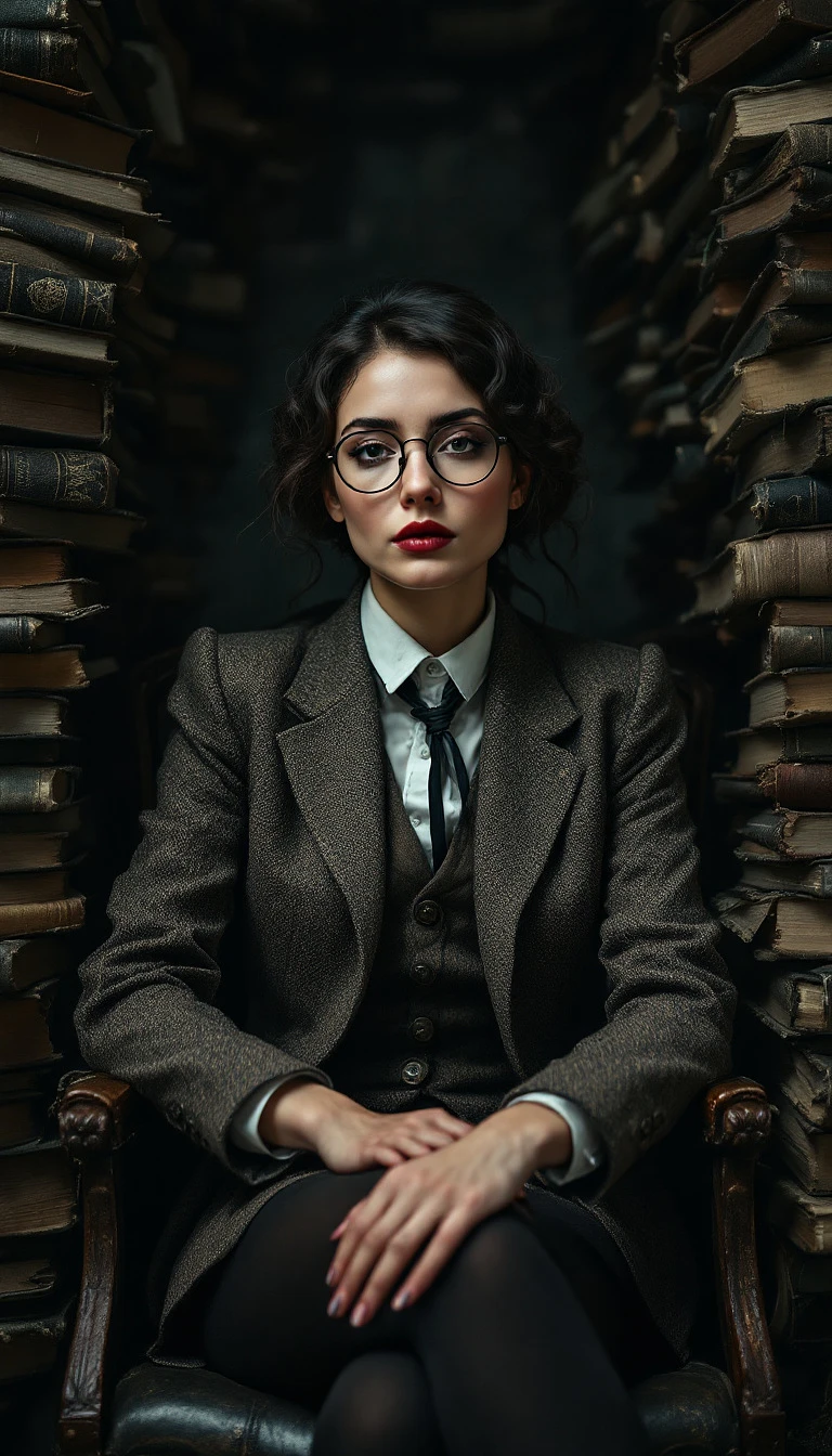 14. A poignant, three-quarter portrait of a woman sitting amidst a decaying library, surrounded by stacks of old books, their pages turned to dust. She wears a vintage, tweed suit and spectacles, and her expression is one of quiet melancholy and nostalgia. The style combines the melancholic atmosphere of gothic literature with the intricate detail of antique interiors.