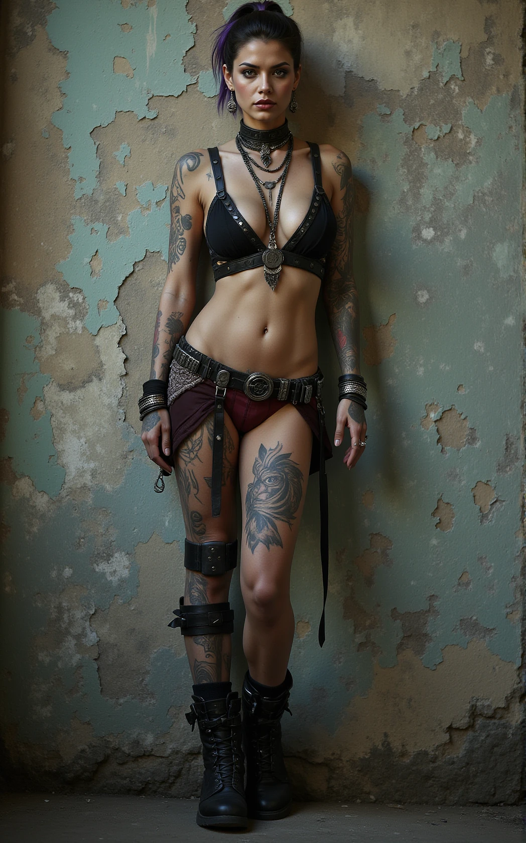 Full-body shot of a striking Gothic punk woman standing confidently against a weathered, textured wall. She exudes an edgy, tribal-meets-bohemian style with her slender frame adorned in intricate tattoos and piercings. Her outfit combines distressed, layered fabrics with bohemian jewelry, featuring a mix of leather, metal, and fabric. The wall behind her is gritty, with peeling paint revealing raw textures and muted colors. The scene captures a modern, raw, and gritty atmosphere, with detailed fashion photography-style lighting that highlights the mix of materials and intricate details in her clothing and accessories, set against a backdrop of urban decay.