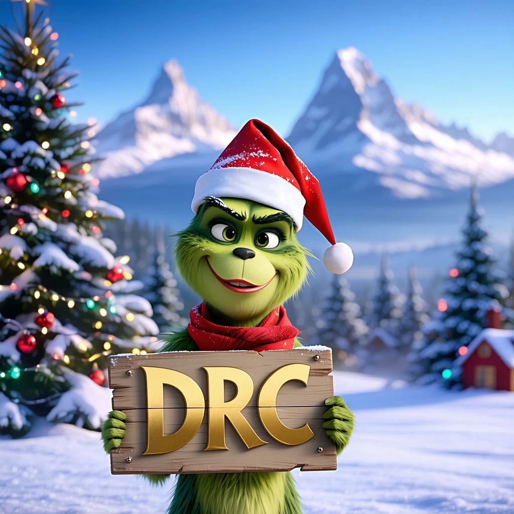 The image is a digital illustration of the character DRC from the animated movie "The Grinch. " Selene is standing in front of a snowy landscape with trees and lights. She is wearing a red and white Santa hat and a red scarf, and is holding a large sign that reads "DRC" in gold letters. Selene has a big smile on her face and is looking directly at the camera. The background is filled with snow-covered mountains and a blue sky. The overall mood of the image is festive and cheerful.