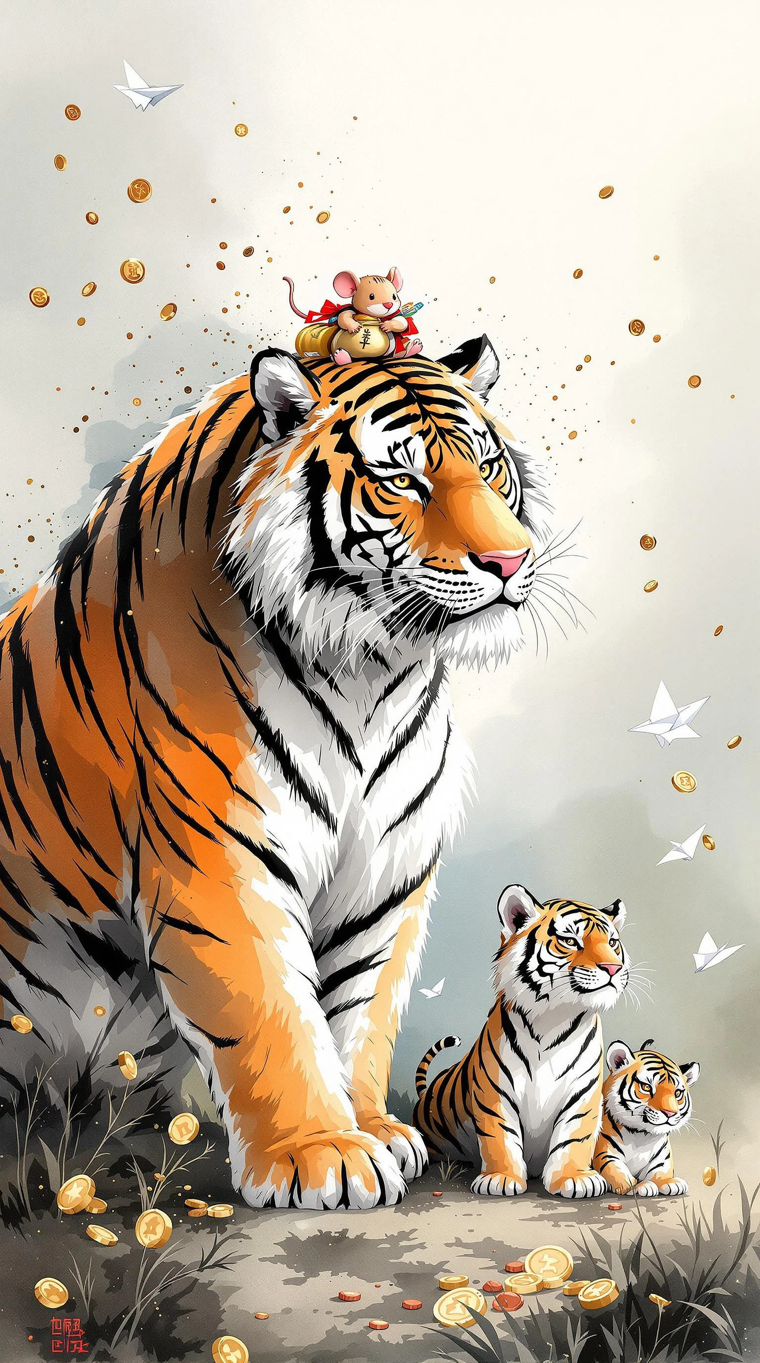A big tiger and two little tigers, with a mouse on the big tiger's head, the mouse holding a talisman, the tiger holding a money bag, scattered copper coins and gold beans in the background, paper airplanes in the background, ink splashes above, rich in details, the tiger is the main subject, ink swirling around its body, in an ink wash style,masterpiece, best quality, original, wallpaper, colorful, covr, everyone, gradient_background, huge_filesize, highres, traditional_media, fine_art_parody, head tilt, ink style,watercolor, masterpiece, best quality, in a meadow, walking, Stay to the right,