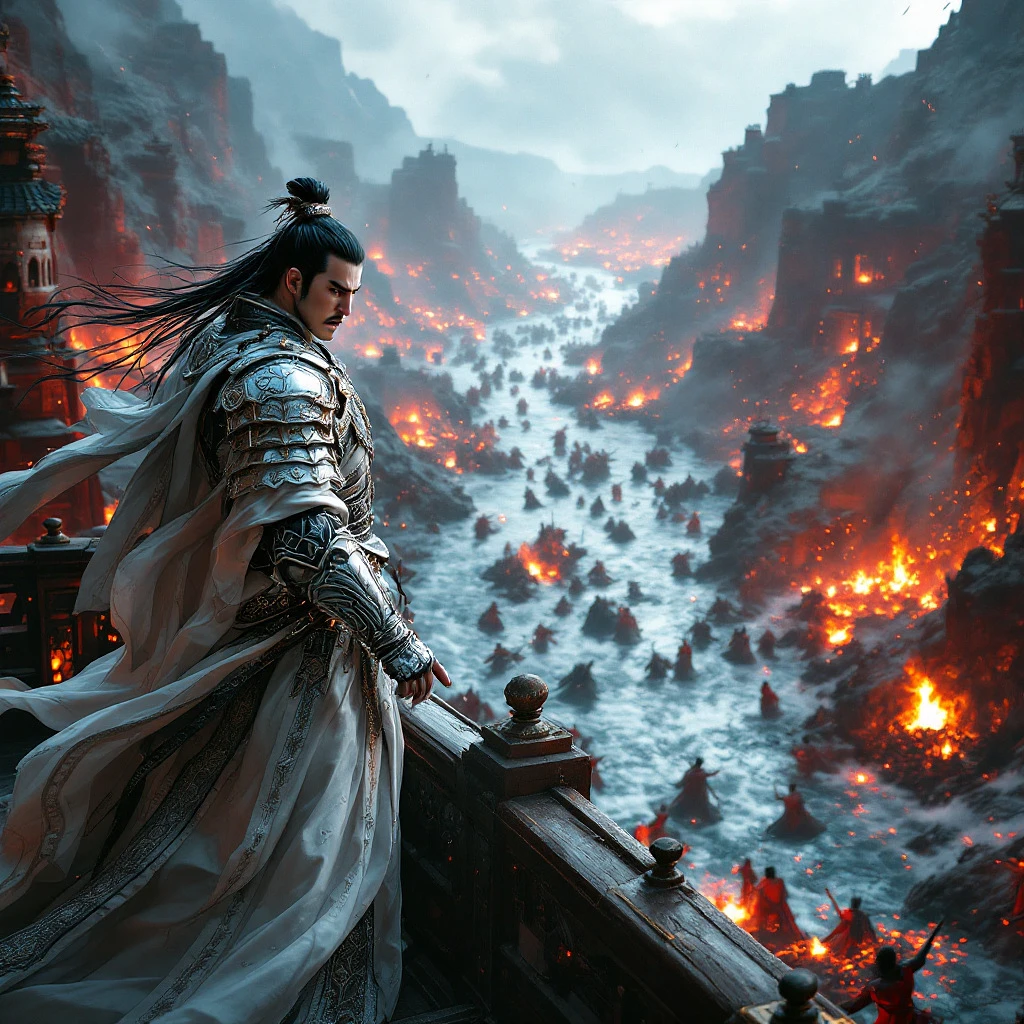 photo-realistic, ultra-detailed, cinematic lighting, chaos and glory in battle, Red Cliff, 208 AD Zhou Yu, standing on a high warship deck, wearing ornate silver-white armor, pointing angrily at the river . . .
