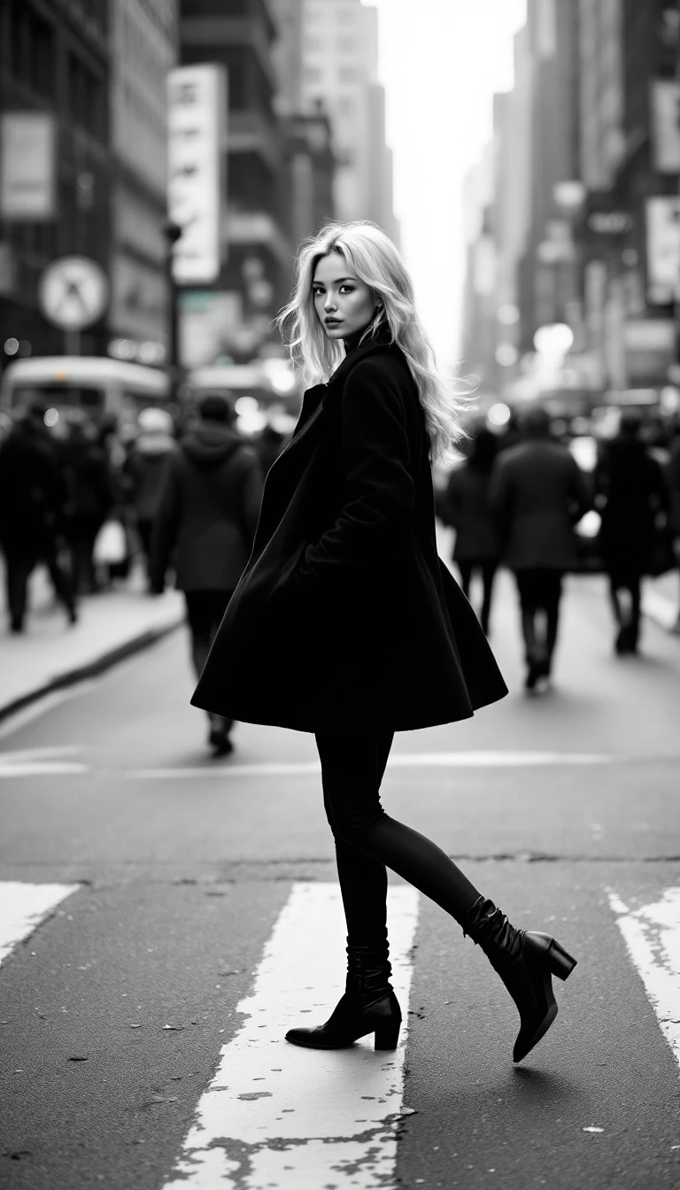Black and white street photography of a Asian supermodel, blonde hair and is wearing a black coat, crossing a crowded street in New York City, looking back towards the camera, with a shallow depth of field and high-resolution, hyper-realistic details, n the style of Peter Lindbergh --ar 63:128 --stylize 750 --v 6. 1