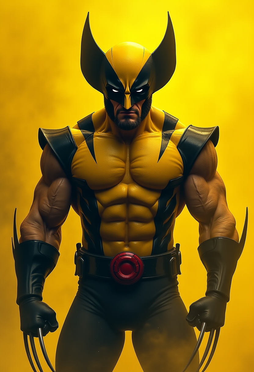 FLUX prompt: Wolverine , dark mist, caricature in his yellow st...
