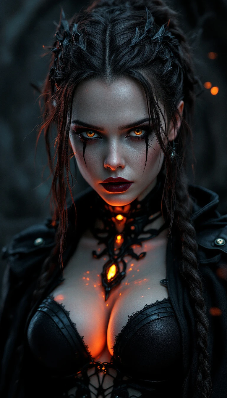 Design a photorealistic portrait of Hayley Atwell with dark makeup and makeup art, set in a dark concept art style. Cowboy Shot, She is a gothic maiden shaman, blending dark realism to create a hyperdetailed character. The portrait captures a cyberpunk angry gorgeous druid, with a fantasy concept art style. It depicts a female necromancer, influenced by Stefan Gesell's work, in a cyberpunk horror style. The dark fantasy character design should be in 4K concept art and hyper realism. Use detailed and vague sentences to emphasize the FLUX on her breasts, ensuring they are the central focus with intricate details and shadows.